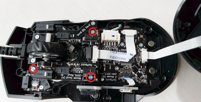 You can do some initial testing at this point by sliding the scroll-wheel back into the encoder, then sitting the top PCB layer back in place. The screws can wait until its time to fully re-assemble the mouse, so just plug your mouse in test the response of the scroll-wheel like this.